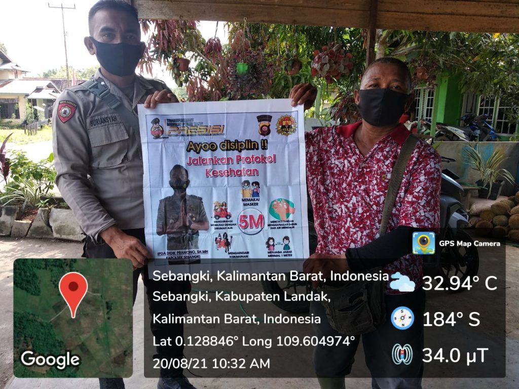 Polres Landak- Polsek Sebangki-Untuk pencegahan penularan wabah virus corona, Kanit Binmas Polsek Sebangki Aipda Suriansyah dengan menggunakan Banner sambangi Warga di Kecamatan Sebangki untuk mengajak masyarakat disiplin mematuhi protokol kesehatan dengan menggunakan masker agar terhindar dari Covid-19, Jumat (20/08/2021 )