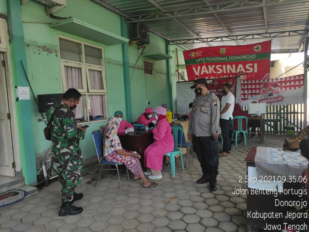 Polres Jepara – Tribratanews.jateng.polri.go.id | Kapolsek Donorojo Iptu M Teguh P bersama personil Polsek Donorojo serta babinsa dan Satgas Covid-19 Kecamatan Donorojo melaksanakan pengamanan vaksinasi Covid-19 Dosis ke 1 terhadap warga masyarakat Desa Clering Kecamatan Donorojo Kabupaten Jepara yang bertempat di Puskesmas Donorojo, Kamis (02/09/2021)
