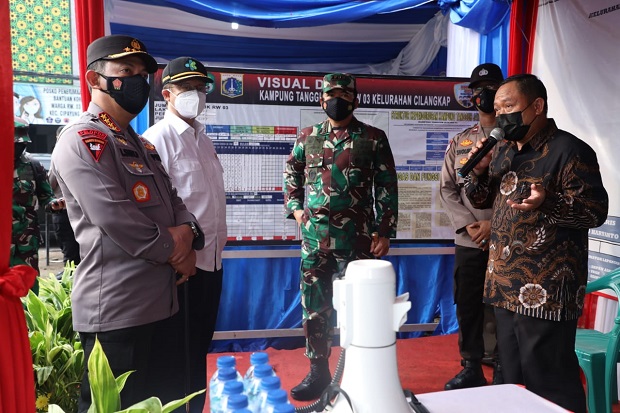 Saat tiba di lokasi, Panglima TNI, Kapolri, Menkes dan Ka BNPB langsung berdialog dengan Ketua RW 03 Roshadi didampingi oleh Danramil Cipayung, Kapolsek Cipayung dan Wakil Camat Cipayung, untuk mengetahui keadaan di lingkungan tersebut serta penanganan terhadap masyarakat yang positif Covid-19. “Kami di RW 03 ini selalu dibantu oleh Danramil, Kapolsek, seluruh warga serta Dasa Wisma (Kelompok ibu rumah tangga, yang berasal dari 10 keluarga yang bertetangga) untuk menangani Covid-19 di wilayah kami,” ujar Ketua RW 03. Baca juga: Covid-19 Varian Beta dan Delta Berbahaya, IDI: Masyarakat Bergejala Segera ke RS